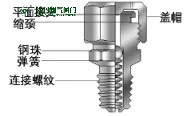 注脂嘴一般由蓋帽、鋼珠、彈簧和帶連接螺紋的本體幾部分組成,典型結(jié)構,如下頁圖2所示。從結(jié)構可見,注脂接頭一般采用底部壓邊結(jié)構將彈簧、鋼珠限制在注脂接頭本體內(nèi)。