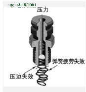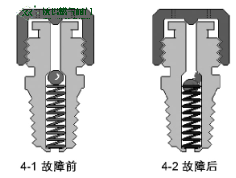如下頁圖3所示,壓邊失效和彈簧疲勞失效是導致注脂接頭失效的重要原因。如下頁圖4-1所示是故障前注脂嘴結(jié)構;如圖4-2所示,則是注脂接頭內(nèi)的止回球由于被污物(沙粒、金屬碎屑、固化脂等)卡住或彈簧失效而無法回復到原位,從而失去止回功能導致泄漏發(fā)生。此外還有止回球鋼珠破損等原因造成注脂嘴產(chǎn)生泄漏。