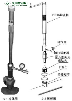 通過采用TDW公司的T101b鉆孔機及其附件,對失效注脂嘴進行在線帶壓拆卸和更換。T101b鉆孔機可實現(xiàn)密閉狀態(tài)下被夾持工件的螺旋式上升和下降(便于螺栓的擰緊和松開),亦可以實現(xiàn)內(nèi)部夾持工件的垂直上升和下降 (便于注脂嘴螺栓擰緊到位后夾持器與工件脫開),T-101b帶壓更換工具(如圖9-1,9-2)。